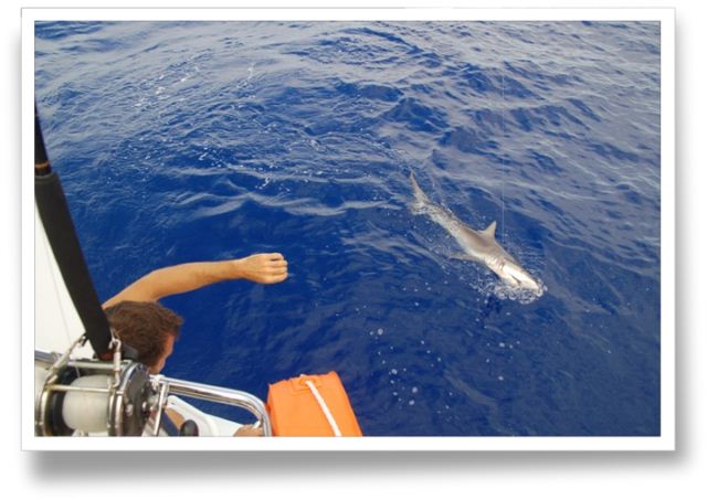 Vanuatu (October 2012) Shark attack!!! |  | Around the island we saw immense underwater life, it seems the whole lagoon was a breeding ground for all kinds of fish. For this reason we saw many sharks, of all sizes, and when we tried trolling from Le Maméju only sharks bit on our lure! Leaving the lagoon we caught this fella, and luckily managed to release him again. |
